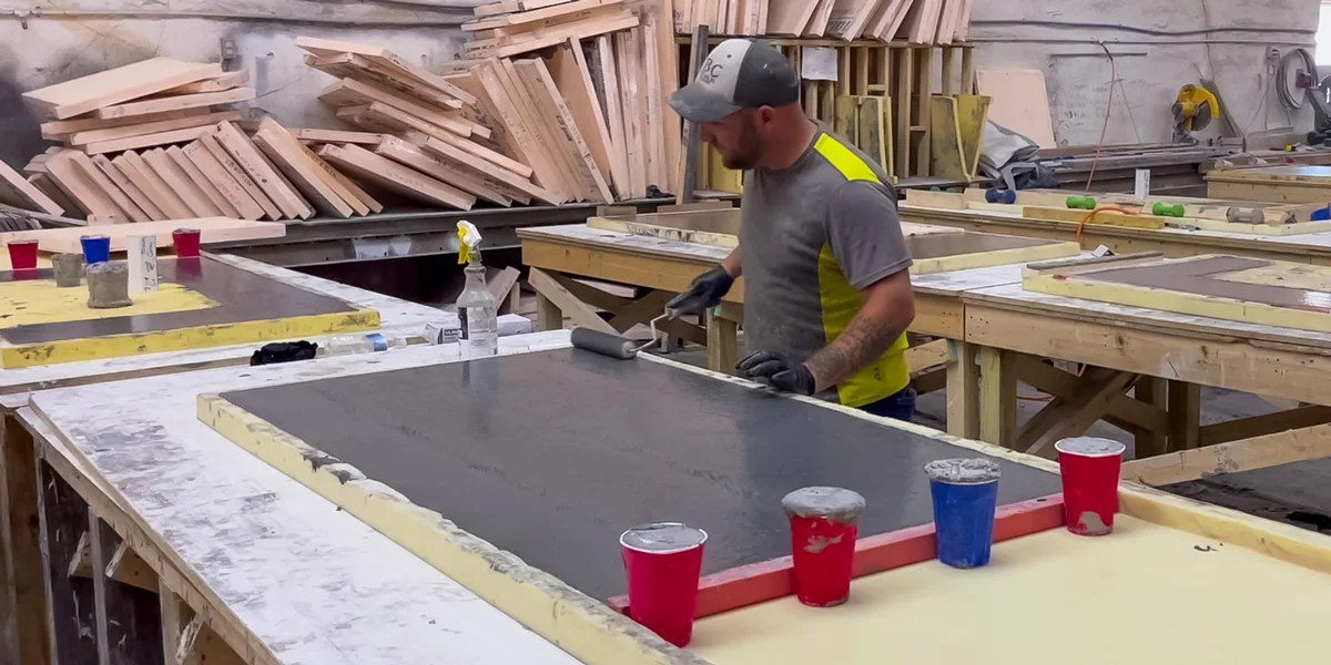 - Day 1-2: At this stage, your outdoor kitchen blueprints are sent to the Casting Department. The Casting Department will create your custom layout by inserting appliance cutouts into panel molds to match your specifications. Before the concrete is poured and the layout is “set in stone”, a Quality Control team member will verify the layout matches your blueprints. Once approved, the Casting Department will mix and pour the concrete in your desired color and reinforce the panels with aluminum channel and composite rebar. Your outdoor kitchen panels and countertops will be allowed to cure for 48-72 hours.