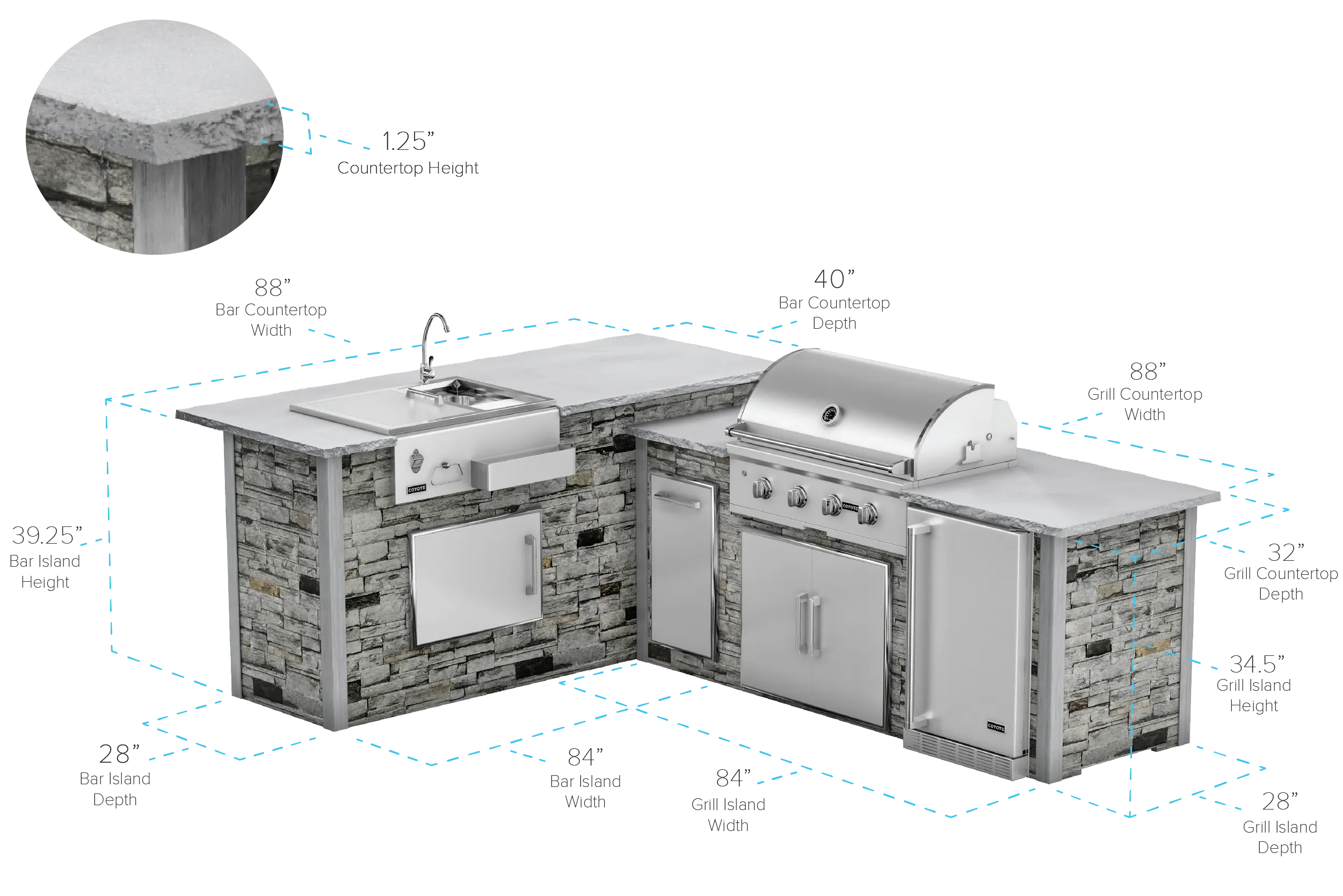 The G7 Refrigeration L-Shape with refreshment bar Island offers all the essentials if you are really looking to host. And for appliances? No more running in and out of the house for beverages and other cooking needs with the Coyote 21” Outdoor Refrigerator! This fully 304 stainless steel refrigerator is made for outdoor use. Access to the interior of your outdoor kitchen for repairs has never been more stylish and functional with the 31” 304 stainless steel double access doors. An added bonus is the 14” Single Pull-Out Trash & Recycle to keep your yard tidy without any extra effort. The Coyote Refreshment Center in the bar island features a drop-in cooler to keep items cool and a small sink to help with cleanup! Access to the bar island has never been more stylish and functional with the 17” 304 stainless steel Single Access Door. As for the grill, this Coyote 36” C-Series Grill is up to the task. You’ll be eating the best food you and your guests have ever had. Here’s the specs: