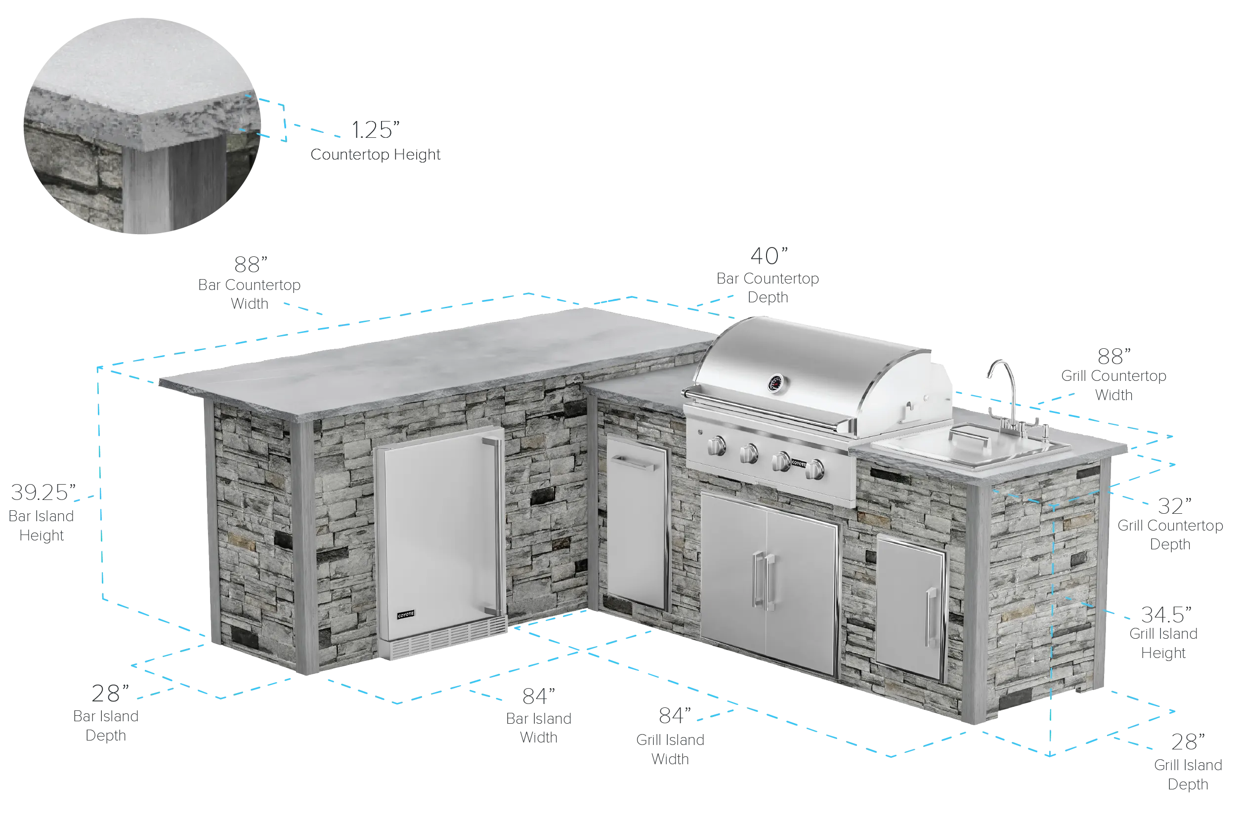 The G7 sink L-shape Island offers lots of options making large gatherings easy. And for appliances? No more dirty dishes that have to be rushed inside! The 304 stainless steel Coyote Outdoor Sink makes cleanup a breeze. Access to the interior of your outdoor kitchen for repairs has never been more stylish and functional with the 31” 304 stainless steel double access doors and single access door under the sink. An added bonus is the 14” Single Pull-Out Trash & Recycle to keep your yard tidy without any extra effort. The 7’ Refrigeration Bar Island is fully furnished with best-in-class appliances from Coyote Outdoor Living. No more running in and out of the house! This fully 304 stainless steel 24” refrigerator is designed specifically for use outdoors. Refreshing beverages for guests and other cooking needs will remain reliably cool in this fridge. And now for the grill… This Coyote 36” C-Series Grill willplease. Friends and family will rave about the food for months to come. Here’s the specs: