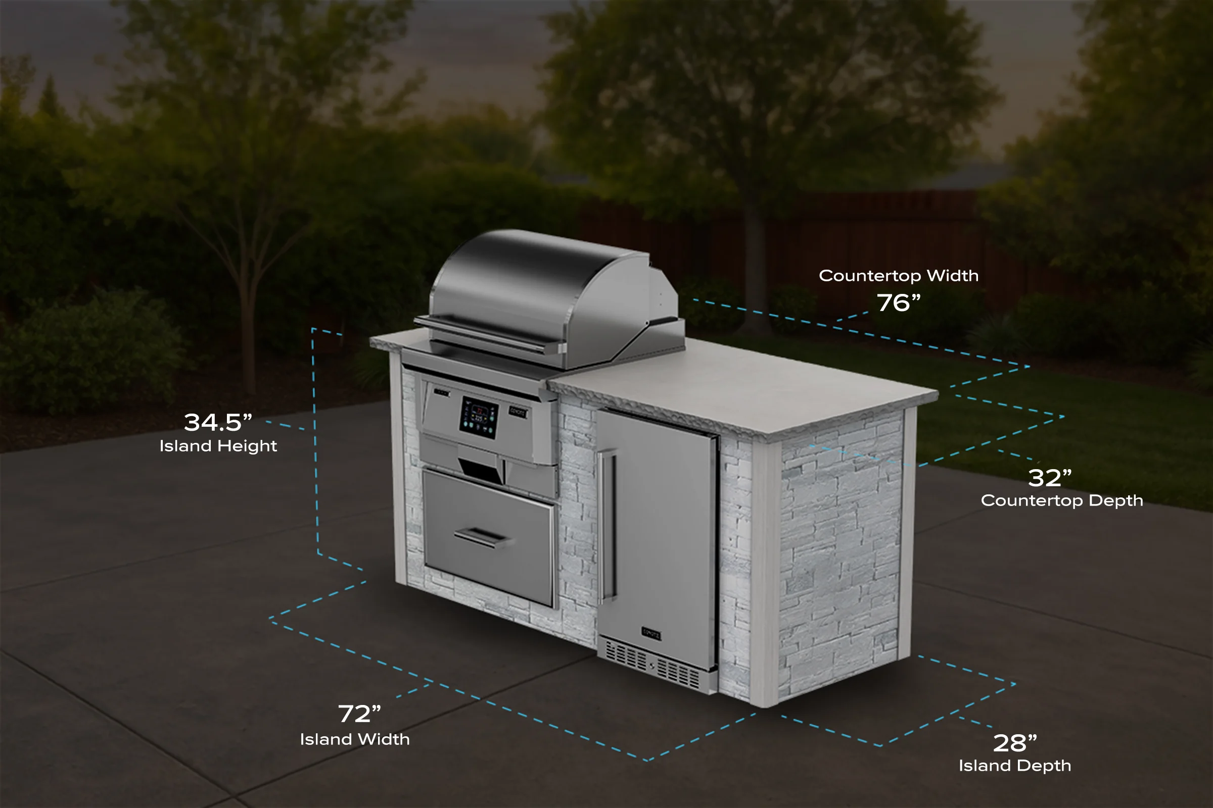 The RTA 6’ Pellet Grill Island has got your outdoor cooking needs covered. It’s true, this island transforms your hosting game! You’ll be equipped to host any medium size gatherings with ease. Not to mention the variety in cooking techniques. And for appliances? No more running in and out of the house for beverages and other cooking needs with the Coyote 21″ Outdoor Refrigerator! This fully 304 stainless steel refrigerator is designed specifically for use outdoors. Wondering where to store your utensils and extra pellets? No need to worry with this 304 stainless steel Coyote 28” Storage Drawer. There’s plenty of space to ensure you have everything you need, right where you need it. Take your grilling game to the next level with the Coyote 28” Pellet Grill. This 304 stainless steel pellet grill from Coyote is the perfect blend of convenience and top-notch flavor. You can grill, sear, smoke, and bake all in one unit! Here’s the specs: