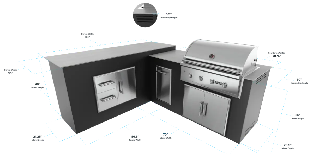 Hosting has never been easier with the M6 L-Shape Waste Bin & Storage Island. You’ll be hosting the same day your outdoor kitchen arrives! And for appliances? The 14” Single Pull-Out Trash & Recycle will keep your yard tidy and spotless without any extra effort. Access to the interior of your outdoor kitchen for repairs has never been more stylish and functional with the 31” 304 stainless steel double access doors. With all the hosting you’ll be doing, the Coyote Double Drawer and Storage Cabinet are perfect for storing utensils and other necessities. And for the grill? The Coyote 36” C-Series grill won’t disappoint. Your guests won’t believe how good the food is! Here’s the specs: