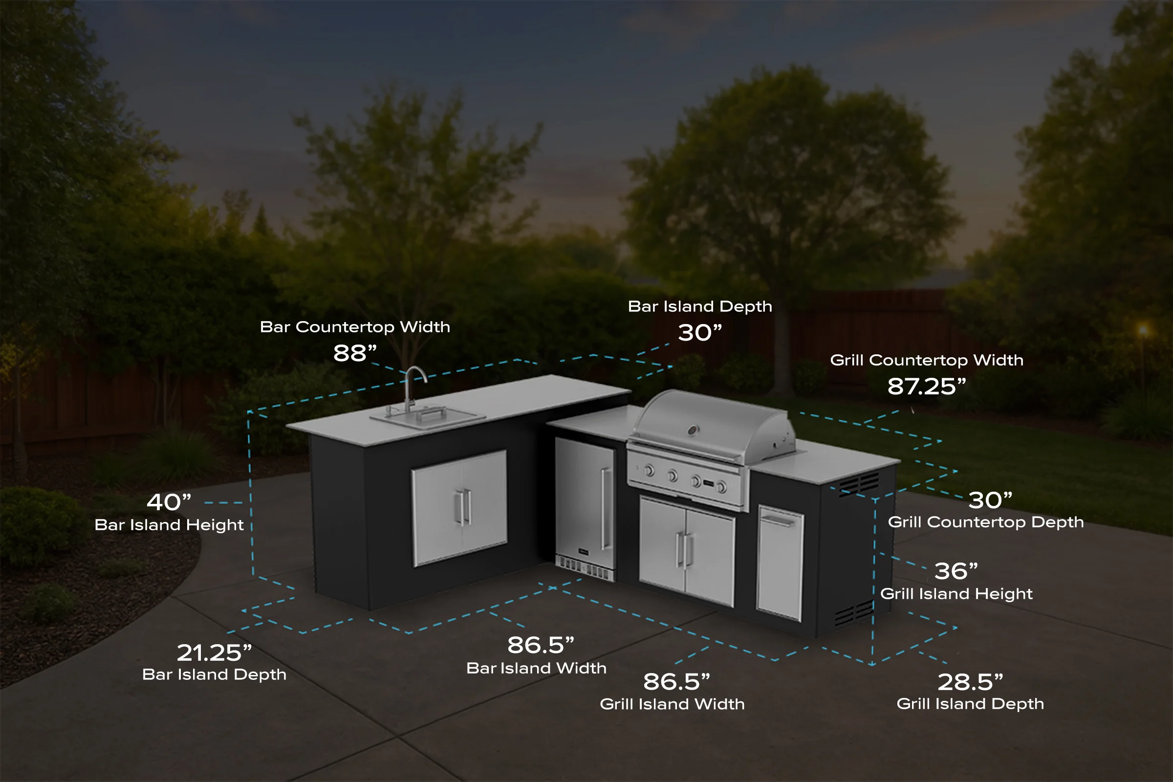 The M7 L-Shape Fridge & Sink Island is exactly what you’re looking for to host the best gatherings possible. Quickly and efficiently. And for appliances? No more running in and out of the house for beverages and other cooking needs with the Coyote 21” Outdoor Refrigerator! This fully 304 stainless steel refrigerator is made for outdoor use. Access to the interior of your outdoor kitchen for repairs has never been more stylish and functional with the 31” 304 stainless steel double access doors. An added bonus is the 14” Single Pull-Out Trash & Recycle to keep your yard tidy without any extra effort. The 304 stainless steel Coyote Outdoor Sink makes cleanup a breeze. As for the grill, this Coyote 36” C-Series Grill is up to the task. You’ll be eating the best food you and your guests have ever had. Here’s the specs: