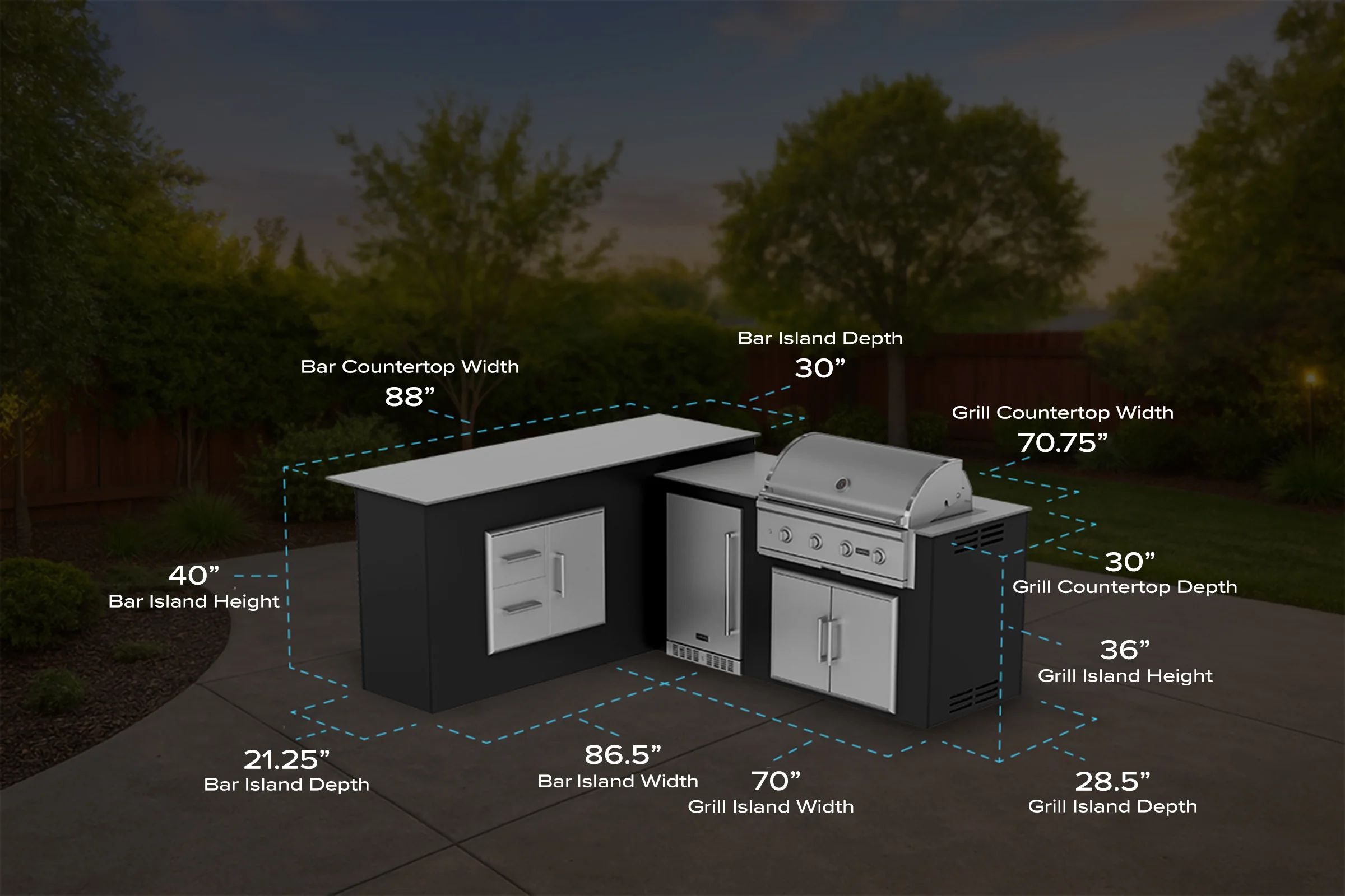 Hosting has never been easier with the M6 L-Shape Waste Bin & Storage Island. You’ll be hosting the same day your outdoor kitchen arrives! And for appliances? The 14” Single Pull-Out Trash & Recycle will keep your yard tidy and spotless without any extra effort. Access to the interior of your outdoor kitchen for repairs has never been more stylish and functional with the 31” 304 stainless steel double access doors. With all the hosting you’ll be doing, the Coyote Double Drawer and Storage Cabinet are perfect for storing utensils and other necessities. And for the grill? The Coyote 36” C-Series grill won’t disappoint. Your guests won’t believe how good the food is! Here’s the specs: