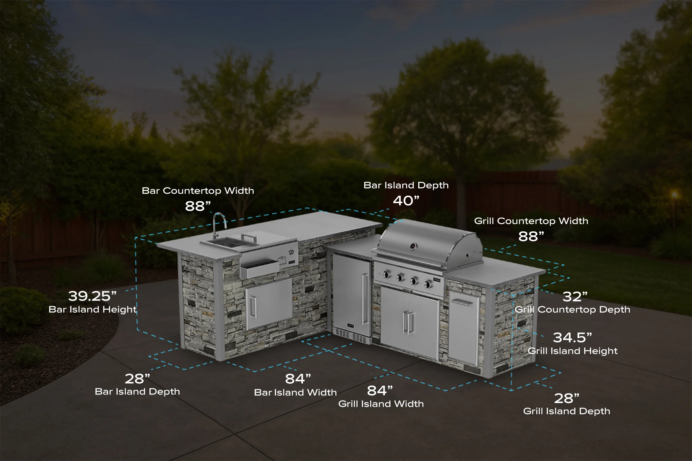 The G7 Refrigeration L-Shape with refreshment bar Island offers all the essentials if you are really looking to host. And for appliances? No more running in and out of the house for beverages and other cooking needs with the Coyote 21” Outdoor Refrigerator! This fully 304 stainless steel refrigerator is made for outdoor use.  Access to the interior of your outdoor kitchen for repairs has never been more stylish and functional with the 31” 304 stainless steel double access doors. An added bonus is the 14” Single Pull-Out Trash & Recycle to keep your yard tidy without any extra effort. The Coyote Refreshment Center in the bar island features a drop-in cooler to keep items cool and a small sink to help with cleanup! Access to the bar island has never been more stylish and functional with the 17” 304 stainless steel Single Access Door. As for the grill, this Coyote 36” C-Series Grill is up to the task. You’ll be eating the best food you and your guests have ever had. Here’s the specs: